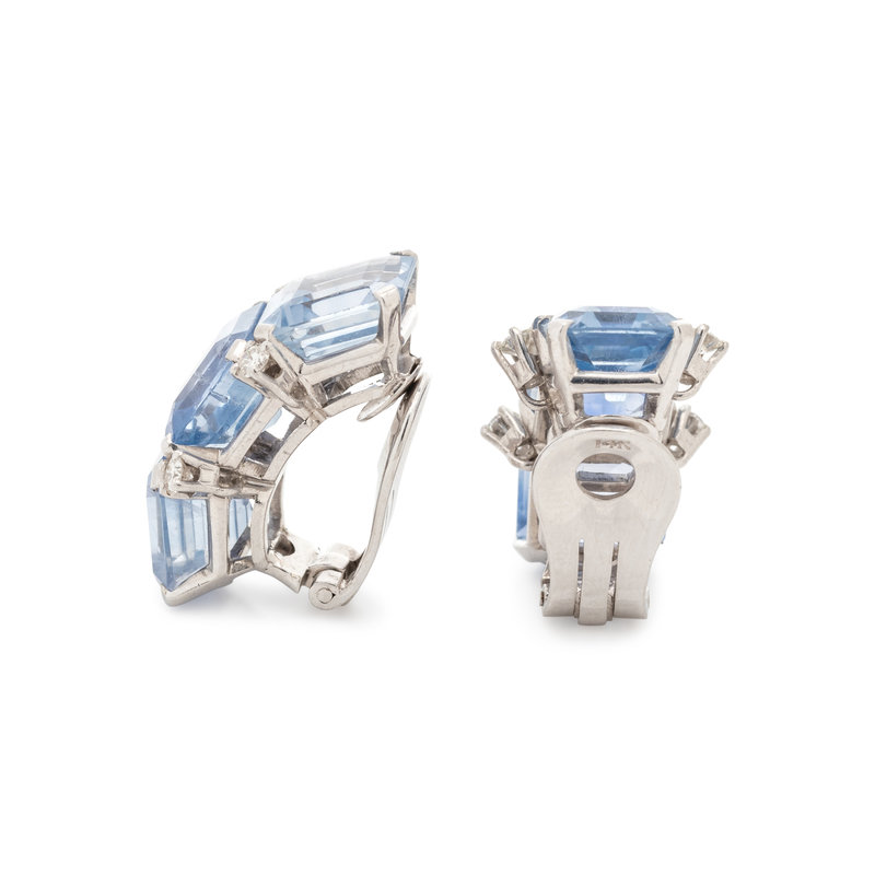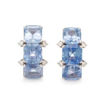 Containing six emerald cut sapphires weighing approximately 20.00-25.00 carats total and eight round brilliant cut diamonds weighing approximately 0.40 carat total. Mounted in platinum with white gold clip backs.