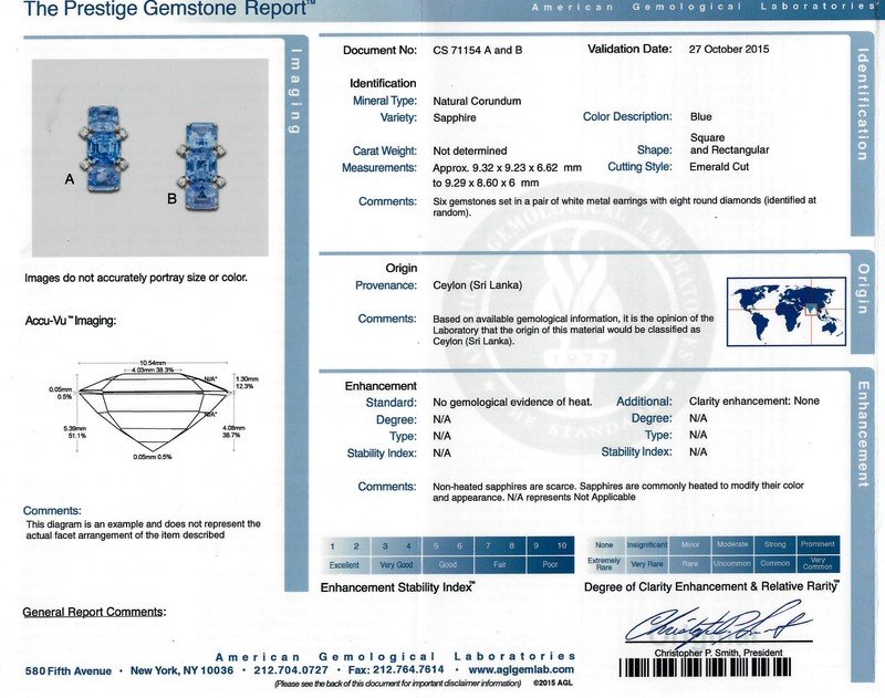 AGL, 2015, Report number CS71154 A and B, Natural Corundum, Sapphire, Ceylon (Sri Lanka), No evidence of heat