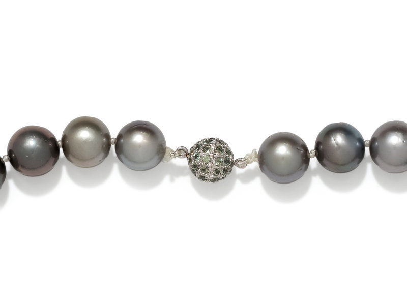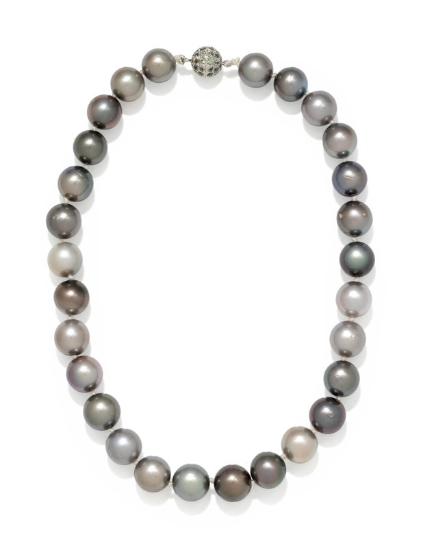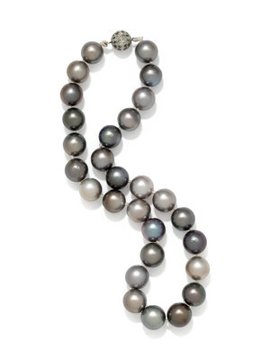 Containing 28 Tahitian pearls measuring approximately 12.15-12.85 mm in diameter, strung knotted in a graduated style with white gold clasp containing numerous round mixed cut gemstones.