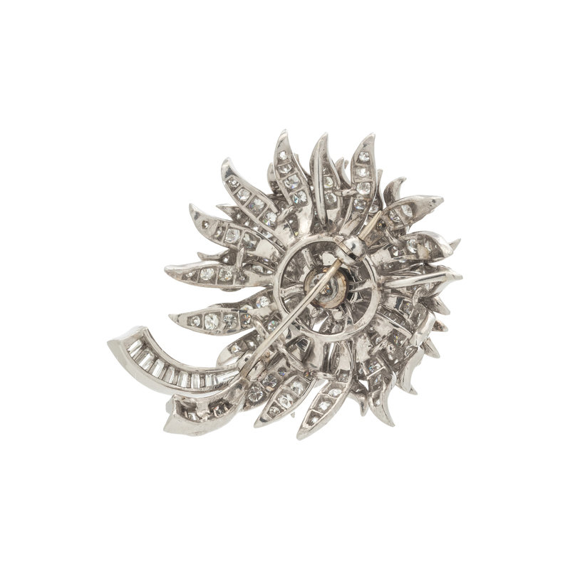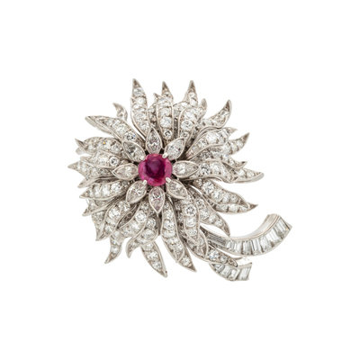 Containing one round mixed cut ruby measuring approximately 5.50 mm in diameter, eight marquise cut diamonds weighing approximately 0.75 carat total, 12 baguette cut diamonds weighing approximately 0.75 carat total and numerous round brilliant and old European cut diamonds weighing approximately 5.00 carats total. Mounted in platinum.