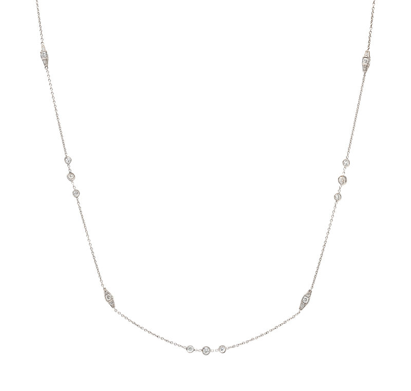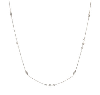Consisting of diamond stations containing 108 round brilliant cut diamonds weighing approximately 7.50 carats total. Mounted in white gold.