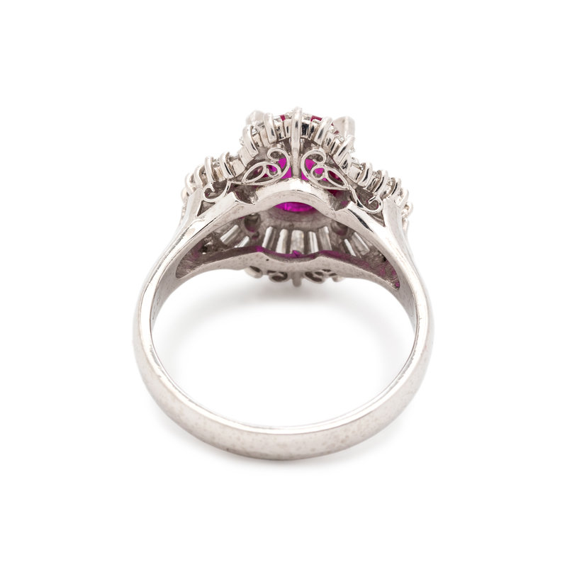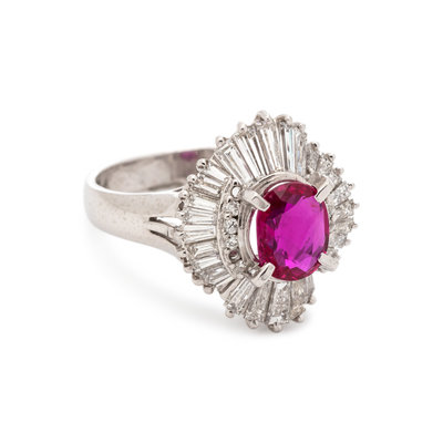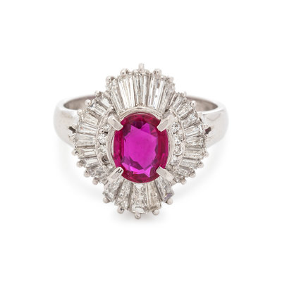 Containing one oval mixed cut ruby measuring 7.46 x 5.86 x 2.85 mm, nine round brilliant and numerous tapered baguette cut diamonds weighing approximately 1.00 carat total. Mounted in platinum.