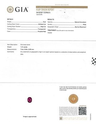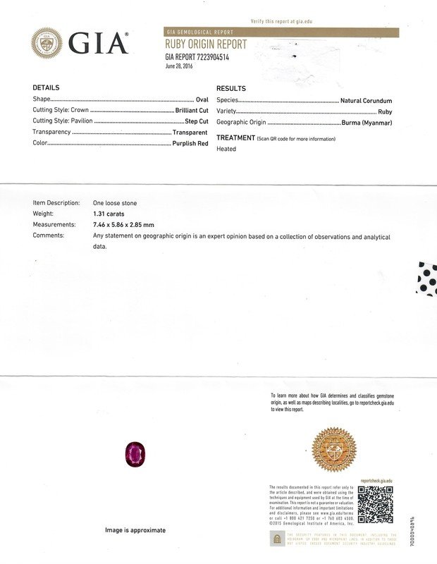 GIA, 2016, Report number 7223904514, Natural Corundum, Ruby, Burma (Myanmar), Heated