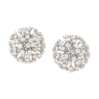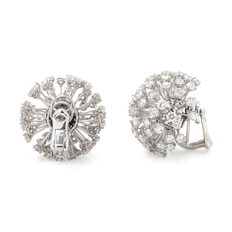 In a dandelion motif, with articulating diamond posts containing numerous round brilliant cut diamonds weighing approximately 6.00 carats total, folding posts with clip backs. Mounted in white gold.