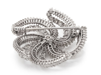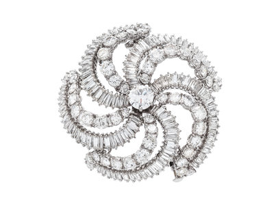 Containing one round brilliant cut diamond weighing approximately 0.75 carat, numerous baguette cut diamonds weighing approximately 7.00 carats total and 50 round brilliant cut diamonds weighing approximately 4.60 carats total. Mounted in platinum.