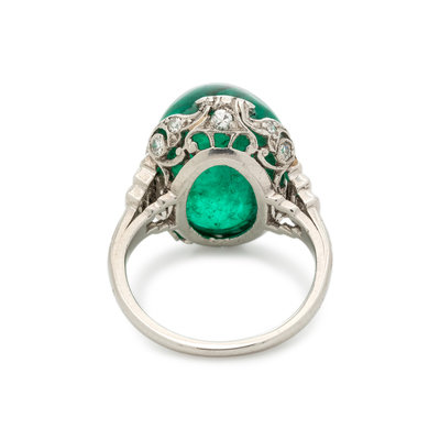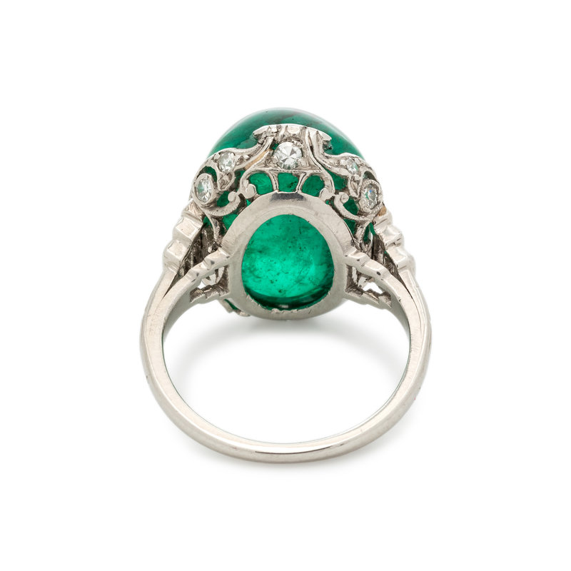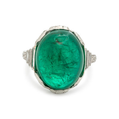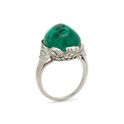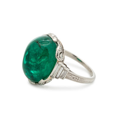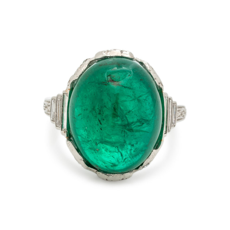 Containing one oval cabochon emerald measuring approximately 13.80 x 11.05 x 9.55 mm, six baguette cut diamonds weighing approximately 0.25 carat total and 10 single cut diamonds. Mounted in platinum.