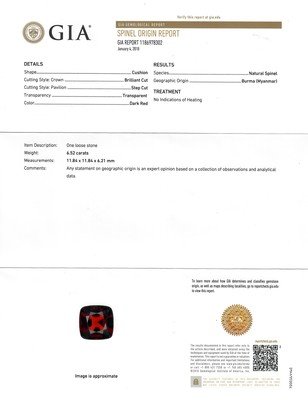 GIA, 2018, Report number 1186978302, 6.52 carats, Natural Spinel, Burma (Myanmar), No indications of heating