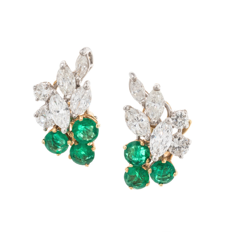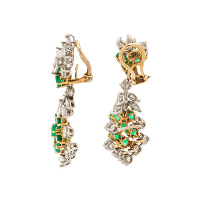 Containing 18 marquise cut diamonds weighing approximately 2.65 carats total, 20 round brilliant cut diamonds weighing approximately 2.85 carats total and 18 round mixed cut emeralds, with removable drops. Mounted in platinum and yellow gold.