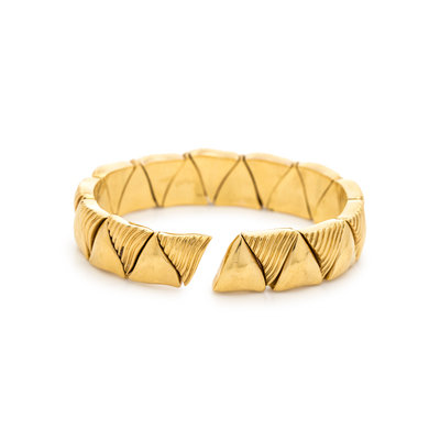 Consisting of a semi-flexible cuff with alternating high polish and ribbed triangular links.