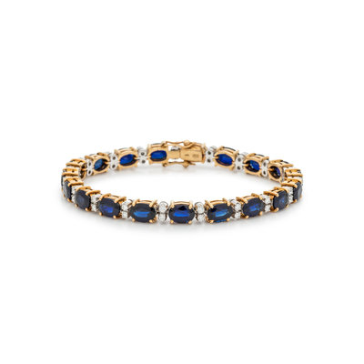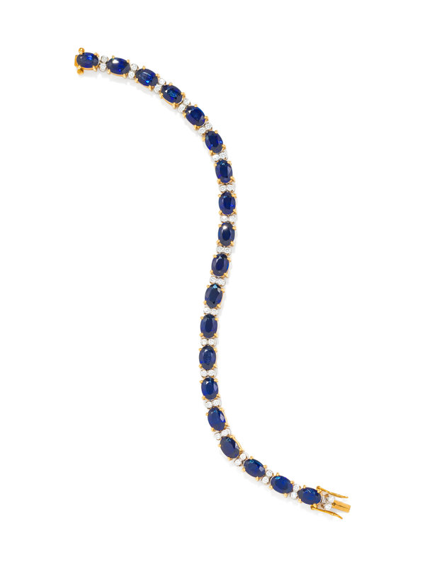 Containing 19 oval mixed cut sapphires weighing approximately 18.00 carats total and 38 round brilliant cut diamonds weighing approximately 0.95 carat total. Mounted in bicolor gold.