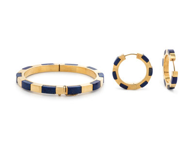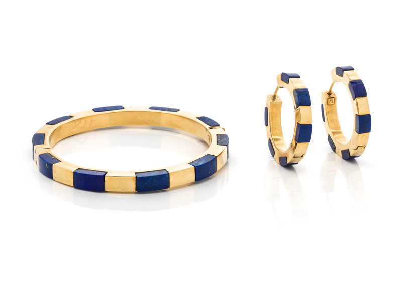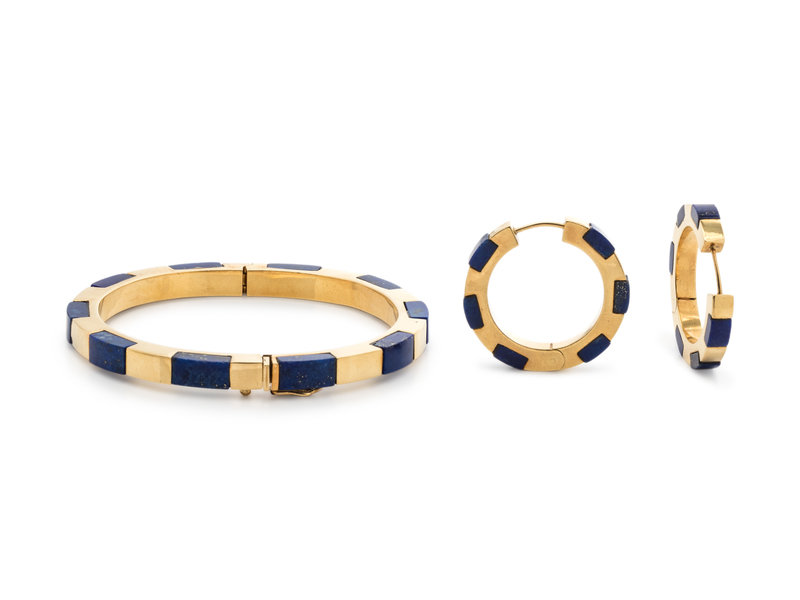Consisting of a bangle bracelet containing 10 inlaid rectangular lapis lazuli, together with a pair of hoop earrings containing 12 inlaid rectangular lapis lazuli.