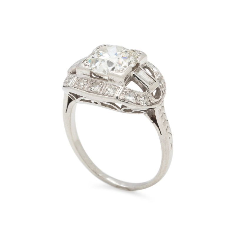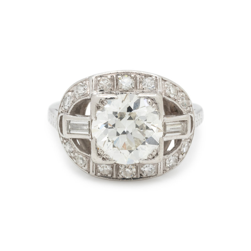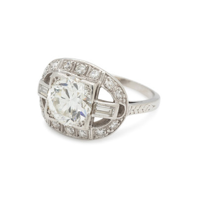 Containing one old European cut diamond measuring approximately 7.85 x 7.85 x 4.80 mm, two baguette cut diamonds and 14 single cut diamonds weighing approximately 0.25 carat total.