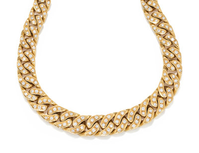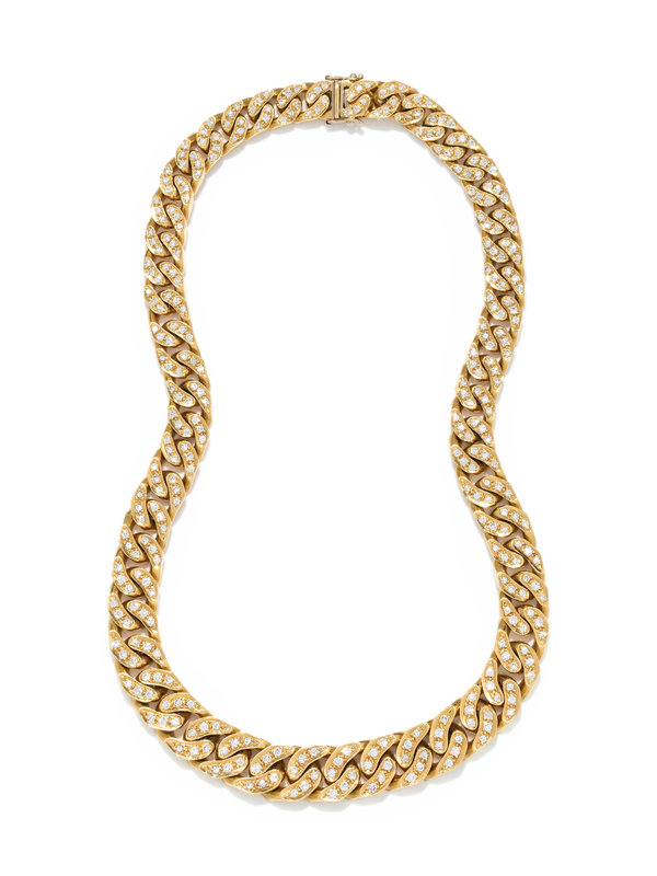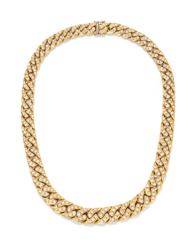 Consisting of a graduated Cuban link chain containing numerous round brilliant cut diamonds weighing approximately 6.00 carats total.