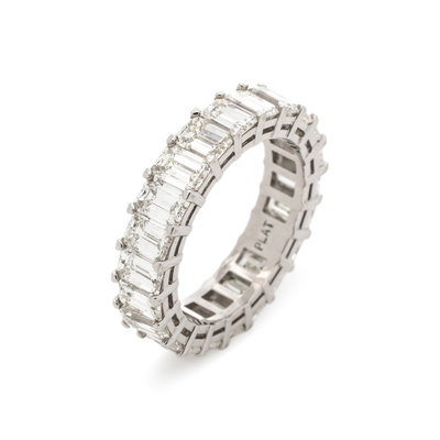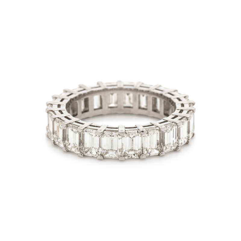 Containing 22 emerald cut diamonds weighing approximately 7.50 carats total. Mounted in platinum. Ring size 6 3/4.