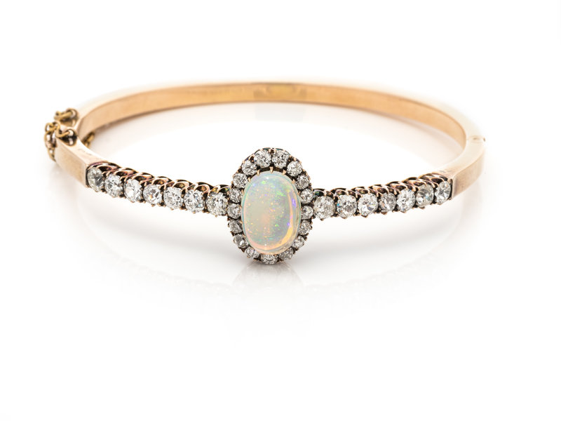 Containing one oval cabochon opal measuring approximately 12.00 x 8.25 x 3.20 mm and 31 old European cut diamonds weighing approximately 2.40 carats total, hinged with side clasp. Mounted in yellow gold.