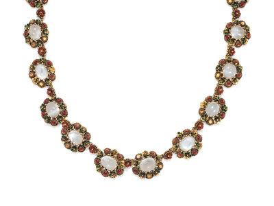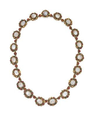 Consisting of graduating links containing 19 oval, cushion and round cabochon moonstones with cannetille and flower motifs with red and green enamel detail. Mounted in yellow gold.