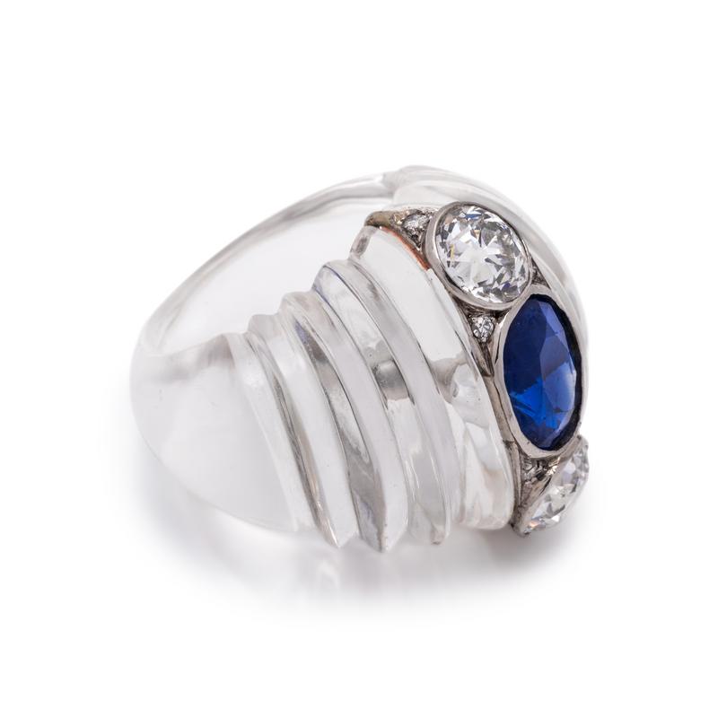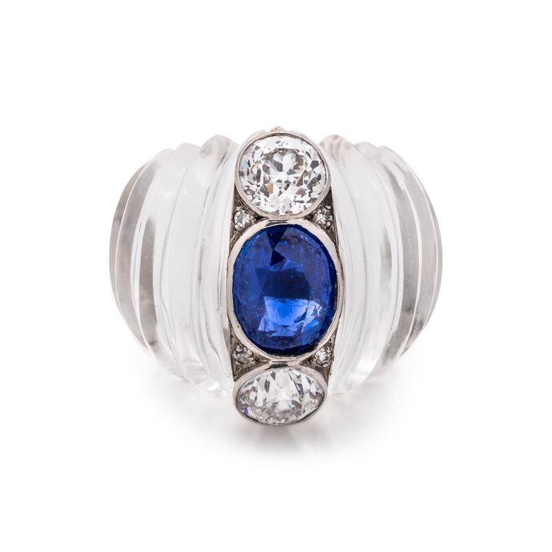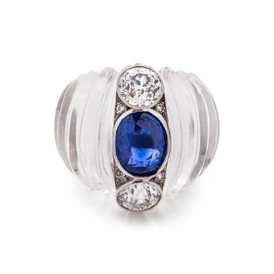 Consisting of a carved rock crystal ring surmounted with a platinum section containing one oval mixed cut sapphire measuring approximately 9.80 x 7.70 mm, two old European cut diamonds weighing approximately 2.05 carats total and six mixed cut diamonds. Mounted in platinum.