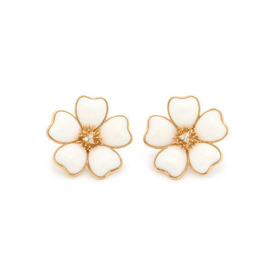 Containing 10 carved coral petals and six round brilliant cut diamonds, folding posts with clip backs. Mounted in yellow gold.