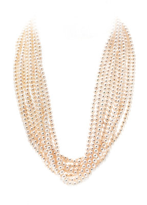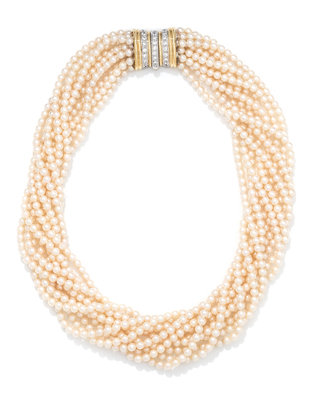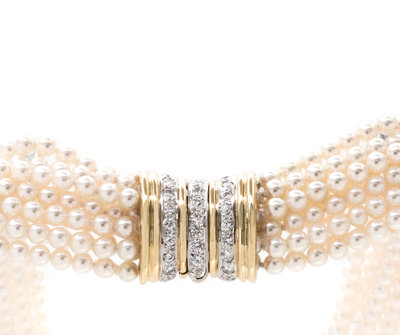 Consisting of 10 strands of pearls measuring approximately 3.50 mm in diameter, with bicolor gold clasp containing 28 round brilliant cut diamonds weighing approximately 0.85 carat total.