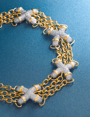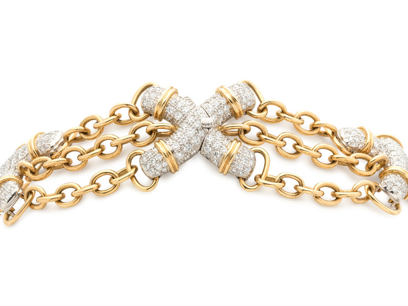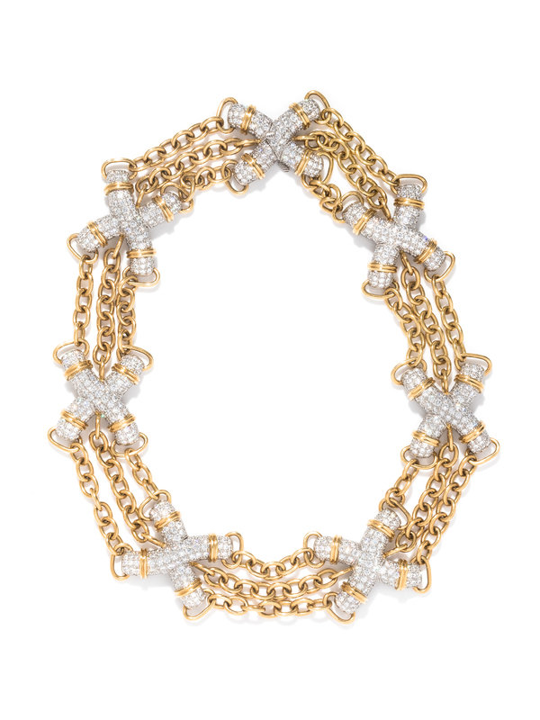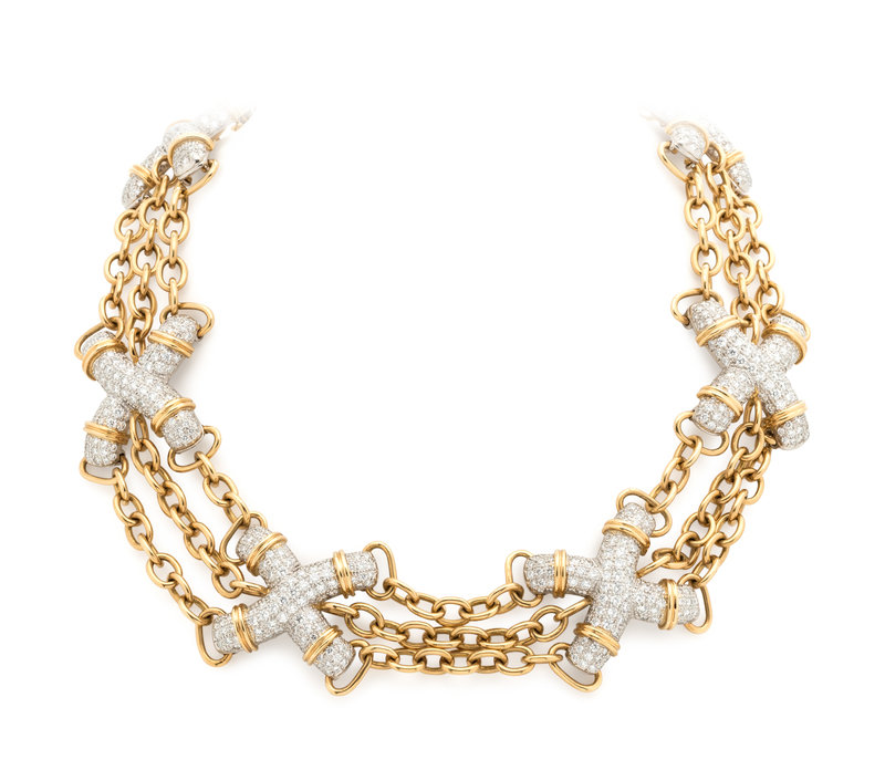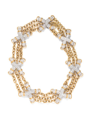 Consisting of three yellow gold cable link chains interspersed with seven platinum 'X' motif links containing numerous round brilliant cut diamonds weighing approximately 15.00-18.00 carats total.