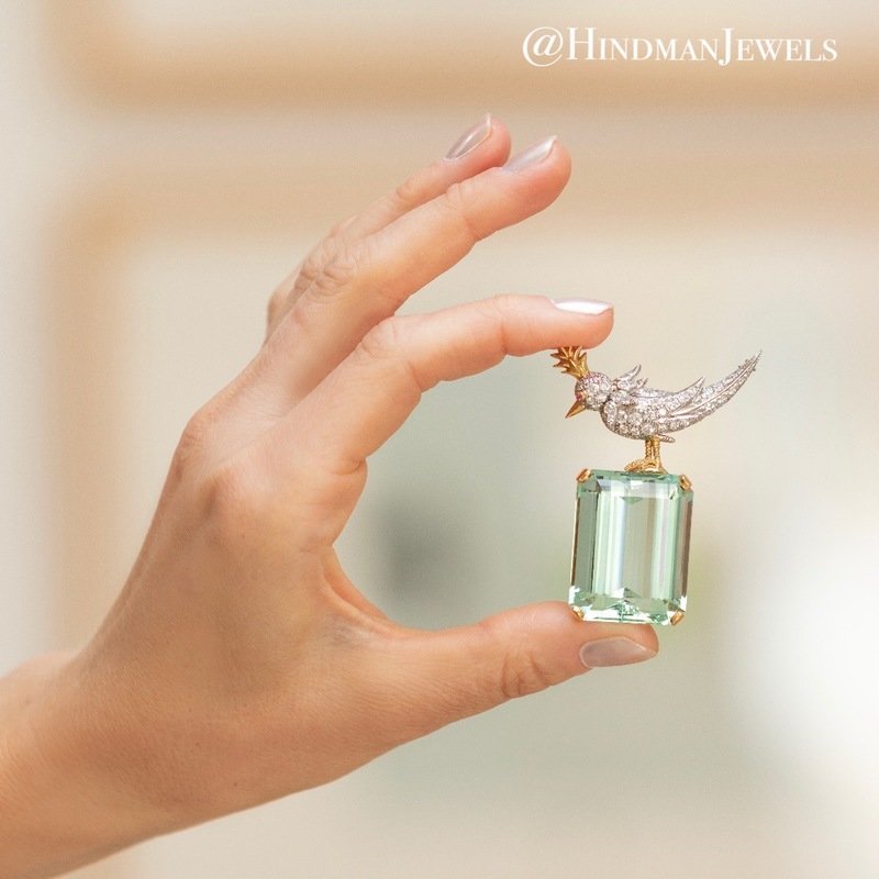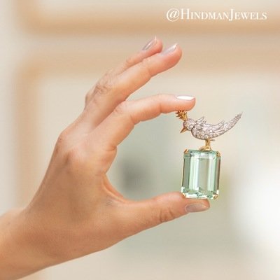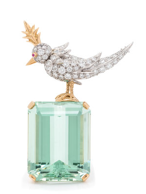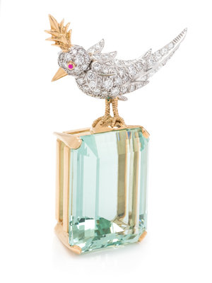Containing one emerald cut green beryl measuring approximately 31.00 x 24.05 x 16.10 mm, with bird perched on top containing numerous round brilliant cut diamonds weighing approximately 2.50 carats total and one ruby eye. Mounted in yellow gold and platinum.