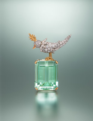 TIFFANY & CO., SCHLUMBERGER, GREEN BERYL AND DIAMOND 'BIRD ON A ROCK' BROOCH