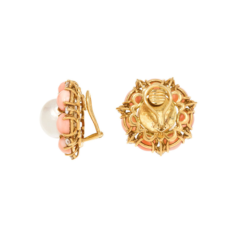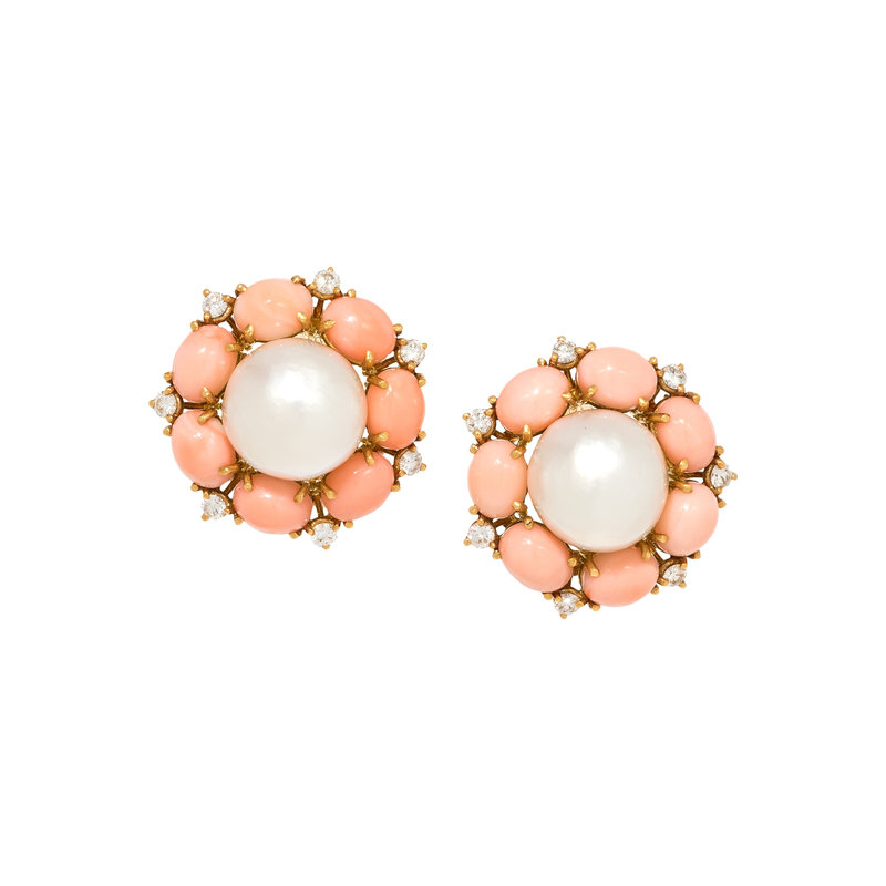 SEAMAN SCHEPPS, CULTURED SOUTH SEA PEARL, CORAL AND DIAMOND EARCLIPS