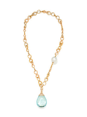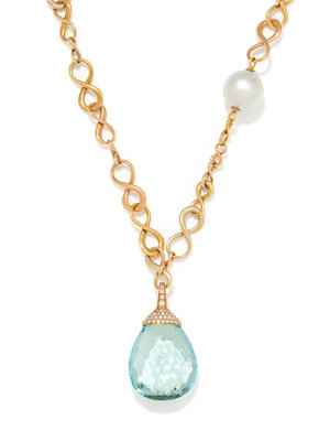 Consisting of a fancy link chain containing one South Sea pearl bead measuring approximately 17.00 mm in diameter, together with a removable pendant containing one pear shaped aquamarine briolette measuring approximately 35.00 x 28.00 x 15.00 mm and 35 round brilliant cut diamonds weighing approximately 0.70 carat total.