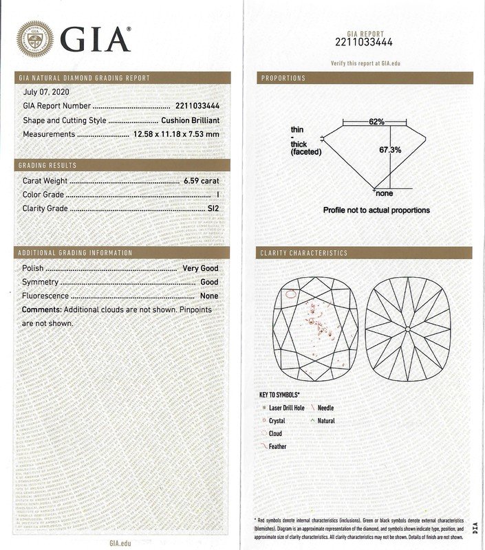 GIA, 2020, Report number 2211033444, 6.59 carats, I color, SI2 clarity with Laser Drill Holes, No fluorescence