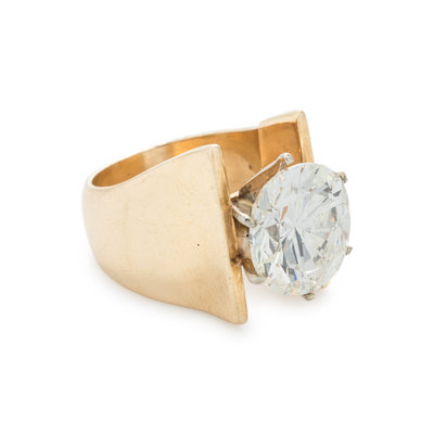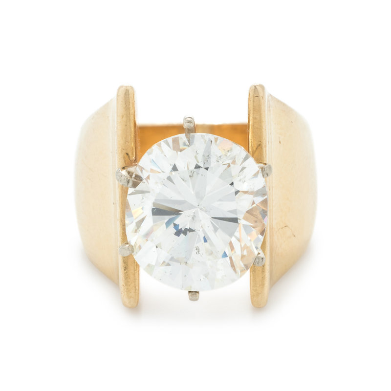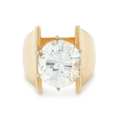 Containing one cushion brilliant cut diamond weighing 6.59 carats. Mounted in yellow gold.