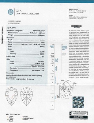 GIA, 2002, Report number 12108093, 1.02 carats, Fancy Vivid Yellow-Orange color, SI1 clarity, Medium yellow fluorescence