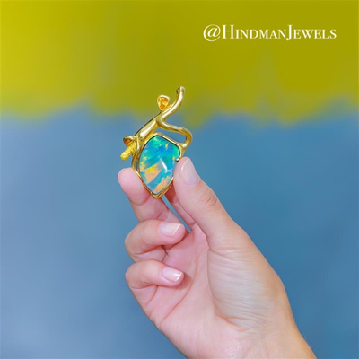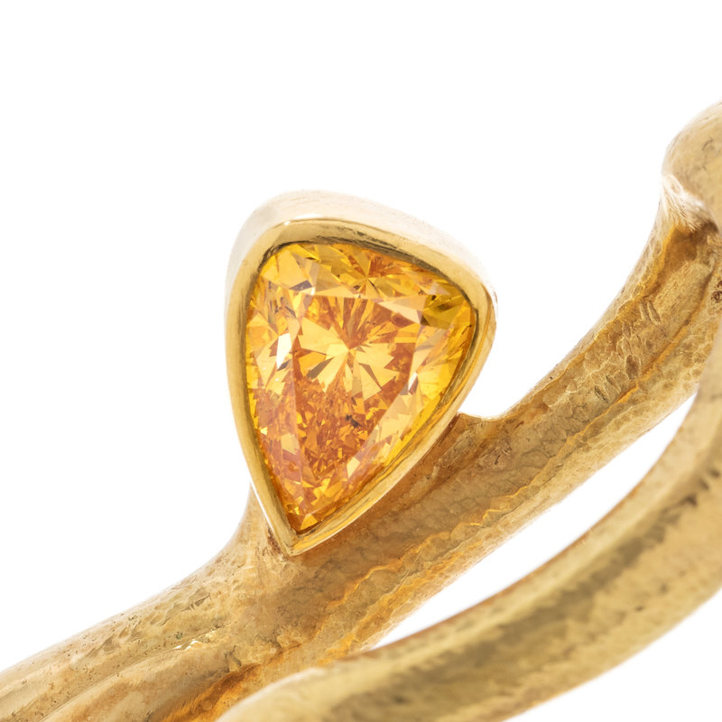 Containing one pear brilliant cut fancy vivid yellow-orange diamond weighing 1.02 carats and one freeform boulder opal measuring approximately 30.00 x 20.00 mm and numerous round brilliant cut colored diamonds (origin of color not tested). Mounted in yellow gold.