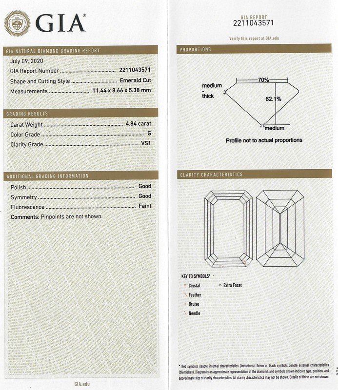 GIA, 2020, Report number 2211043571, 4.84 carats, G color, VS1 clarity, Faint fluorescence
