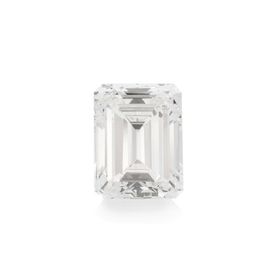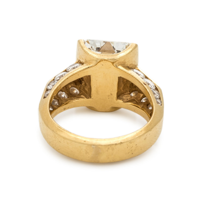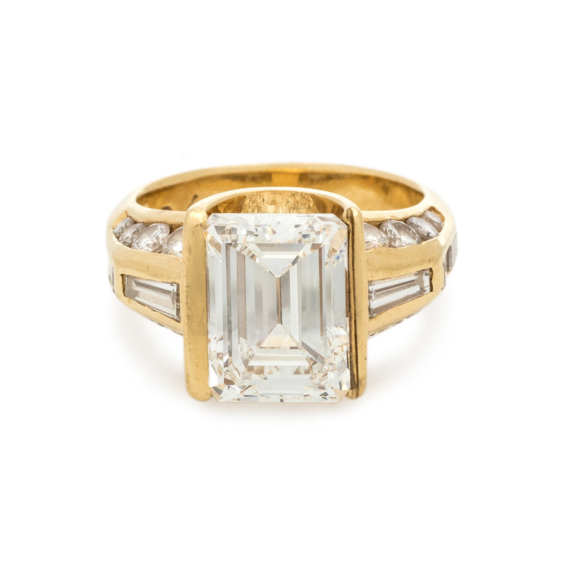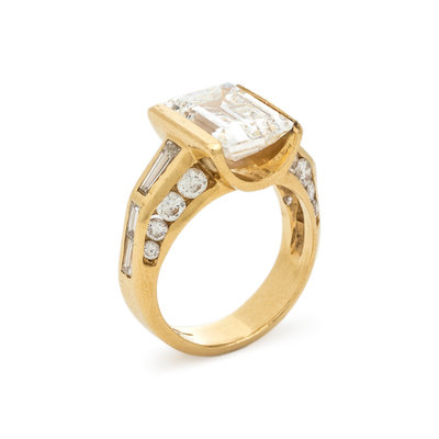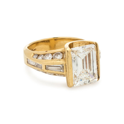 Containing one emerald cut diamond weighing 4.84 carats, six baguette cut diamonds weighing approximately 0.65 carat total and 32 round brilliant cut diamonds weighing approximately 0.85 carat total. Mounted in yellow gold.