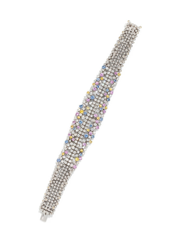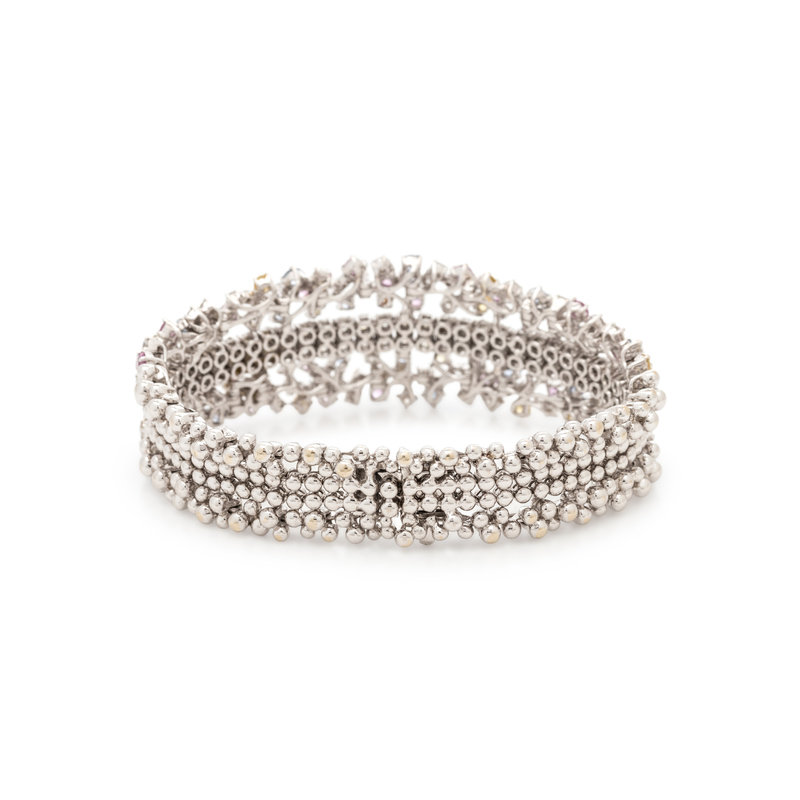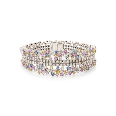 Containing numerous round brilliant cut diamonds weighing approximately 5.50 carats total and numerous round mixed cut blue, pink and yellow sapphires measuring approximately 2.20-3.20 mm in diameter. Mounted in white gold.