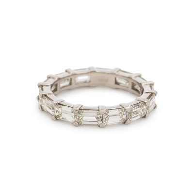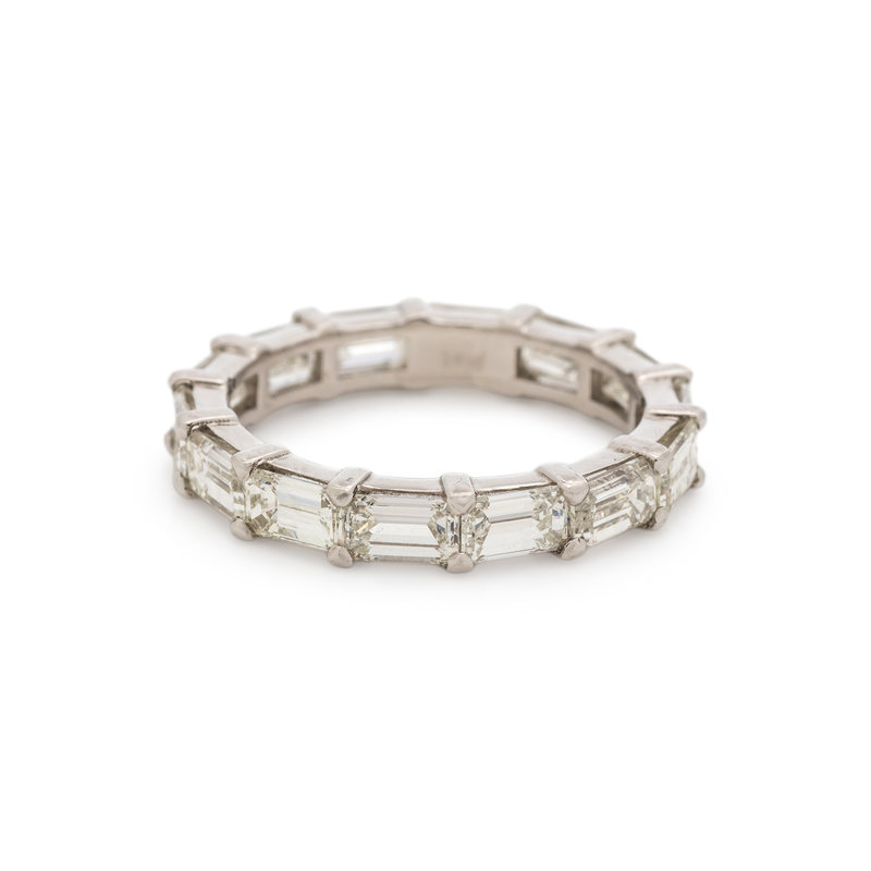 Containing 14 emerald cut diamonds weighing approximately 4.25 carats total. Mounted in platinum. Ring size 6 3/4.