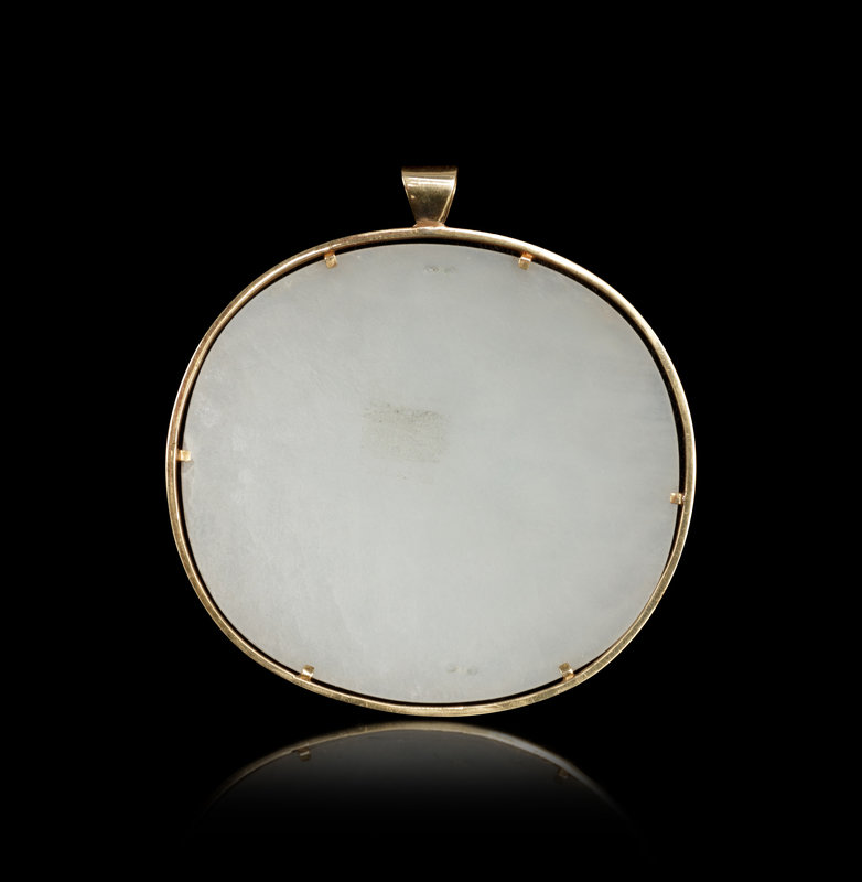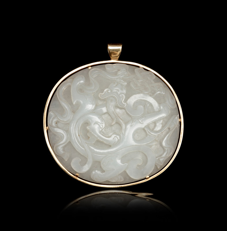 the stone of an even white tone, the oval panel carved in high relief depicting a sinuous chilong chasing an endless knot, mounted with gilt metal as a pendant.