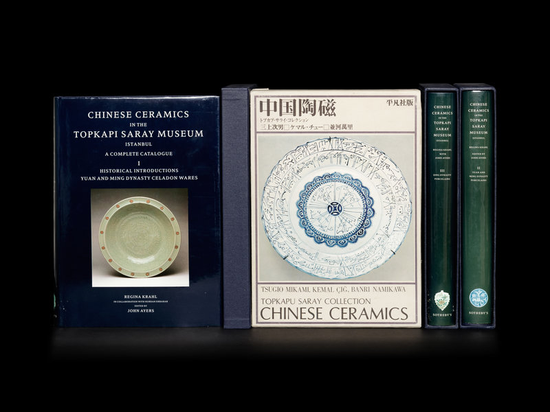 KRAHL, Regina and AYERS, John. Chinese Ceramics from the Topkapi Saray Museum Istanbul: A Complete Catalogue. London: Sotheby's Publications, 1986. 3 volumes. Pictorial dust jackets, slipcases. Color and black and white plates with descriptions in English. LIMITED EDITION number 107 of 750 copies.