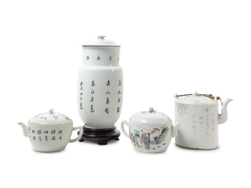 清晚期 粉彩人物故事圖蓋瓶一件,茶壺兩件,墨彩人物圖茶壺一件