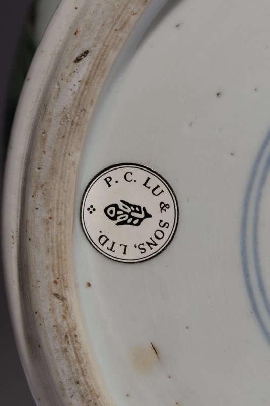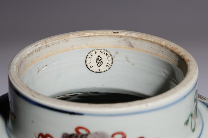 each having board shoulder above a spreading foot, the main panel painted to show an official seated accompanied by his attendant, conversing with a couple below bands of lappet leaves, bogu motif and ribbon-tied Buddhist emblems, the underside with an underglaze blue double ring, together with a reticulated wood cover and a hardwood stand.