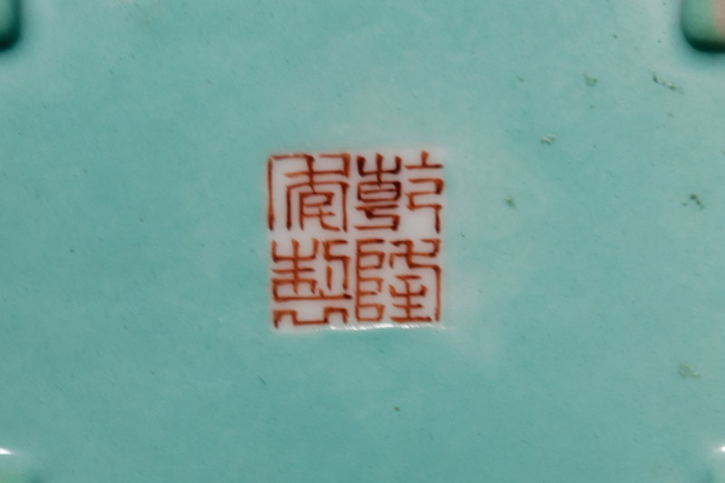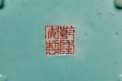 of square section on four bracket feet, each side decorated with a rectangular panels, two with mountainous landscapes, two with poems, the interior and the underside glazed turquoise, bearing a Qianlong four-character iron red mark.