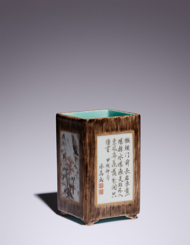 仿竹紋粉彩開光山水詩文圖四方筆筒