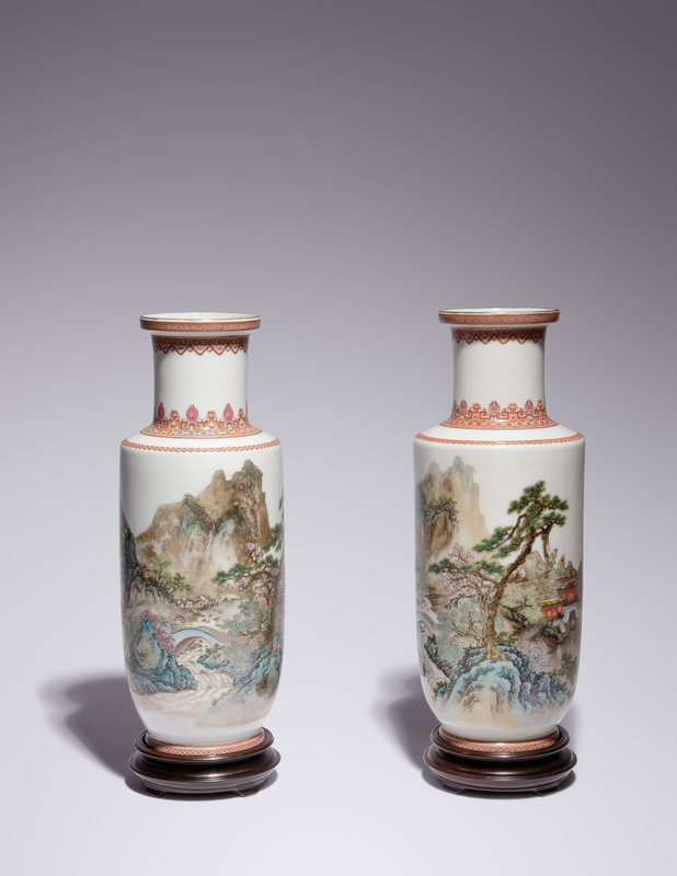 each rouleau vase rising from a slightly spreading foot to a tall cylindrical neck and a dished mouth, the main body decorated with a mountainous landscape with figures at various tasks, the underside bearing a Yawan zhencang four-character seal mark.