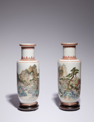 雅玩珍藏款 粉彩山水圖小棒槌瓶一對