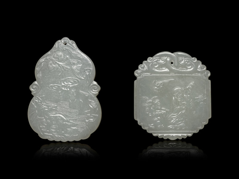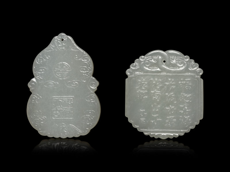 the first in the shape of a gourd, the front carved in shallow relief depicting a riverscape scene with bat, peach, deer and crane, the reverse with a shou medallion above four characters within a square panel, enclosed by clouds and bats; the second a irregular form, the front decorated with the immortal of longevity with a child, the reverse with a poem, the upper register carved in teh shape of two entwined dragons.