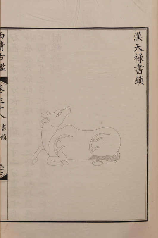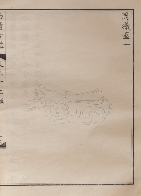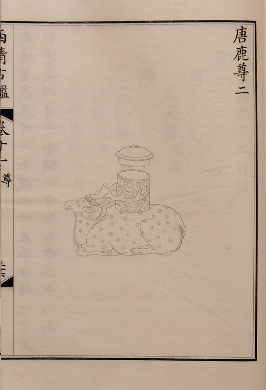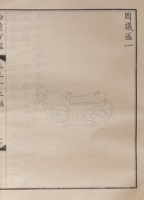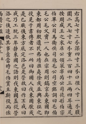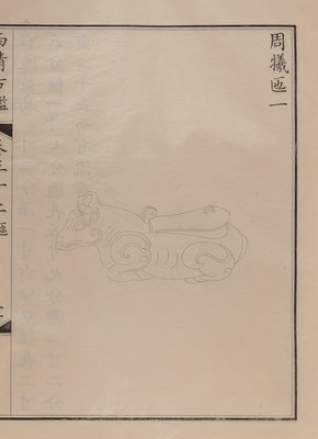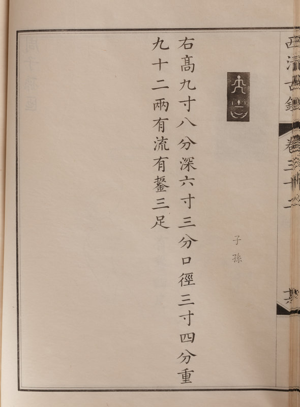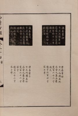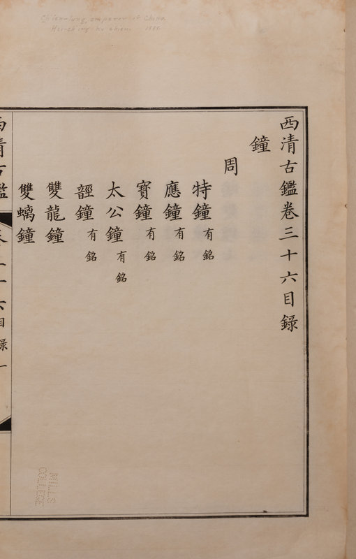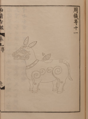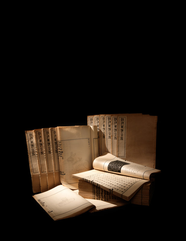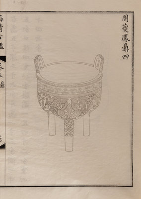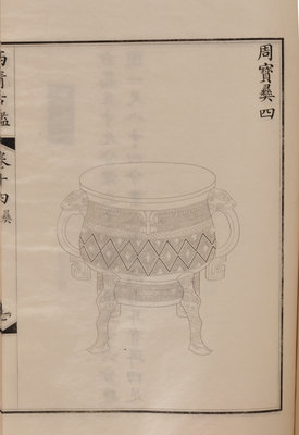 A nineteenth century printing of the catalogue of the ritual bronzes in the collections of the Qianlong Emperor, first published in 1793 by his commission of 1,594 bronzes. During the Guangxu period, the Qing court sent an embassy to Japan, who saw a private printing of the work, whereupon officials in China raised funds to purchase the 96 boxes of plates from Japan, from which a printing was finally sent in 1893 back to the court.