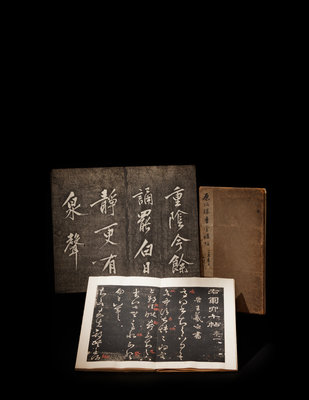 2 folding albums, 292 x 273 mm. The first from the stele of Huanxiang Tang, comprising 27 leaves, with annotations by the classics scholar Hu Xiaoshi (1888-1962), dated to the Dingchou year (1927), National China Bookstore in Beijing label. The second form the stele of Wang Xizhi‘s calligraphy, comprising 12 leaves, with annotations in red ink and one collector's seal: Lin hu xiao xuan cang shu.