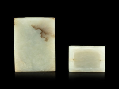 each of rectangular form, the first of a mottled stone with dark russet streaks, carved on the front in high relief with a tiger head forming the hook and an oval knob; the second of an even white stone, of rectangular form, carved in shallow relief showing various characters.
