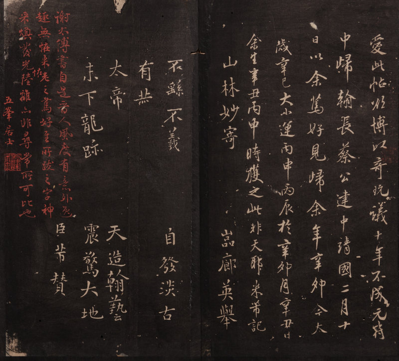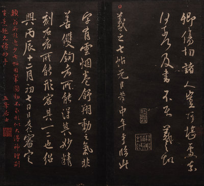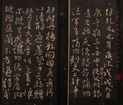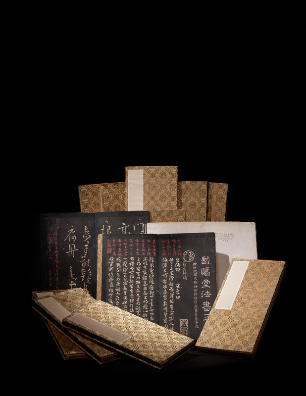 15 volumes, 292 x 156 mm. Folding albums of ink rubbed on paper, with annotations from Dong Shining, an official during the Qianlong period posted in Zhejiang, and two seals: Wu feng ju shi and Dong shi ning jian zang yin. Each album mounted between gold ground russet and emerald brocade silk covered boards. Missing the fifth album, otherwise complete.