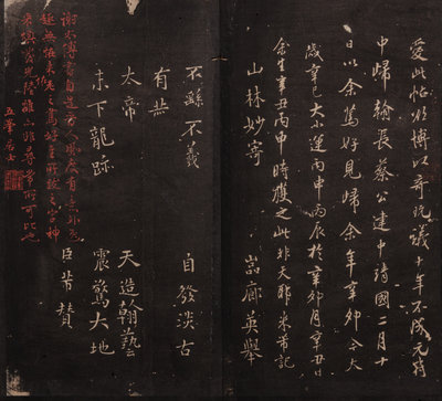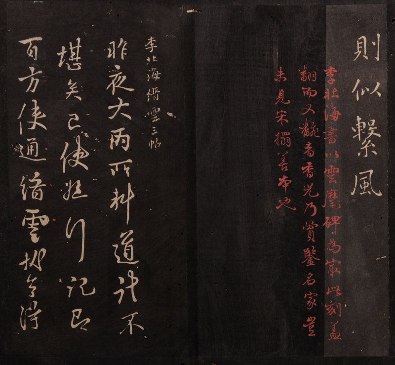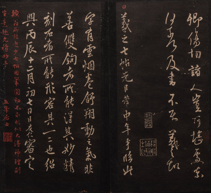 此帖萬曆三十一年(1603)刻畢,是年董氏四十九歲,名聲正盛,所以當時就廣爲風行。石版真本有施叔灝“用大齋本”、王儼齋“橫雲山莊本”以及沈屺雲“古倪園本”三種。北京故宮、國圖、首圖、吉圖收有明拓原石本、翻刻本、清拓拼湊本等數種。經比較,本部當爲清初之拼凑本。